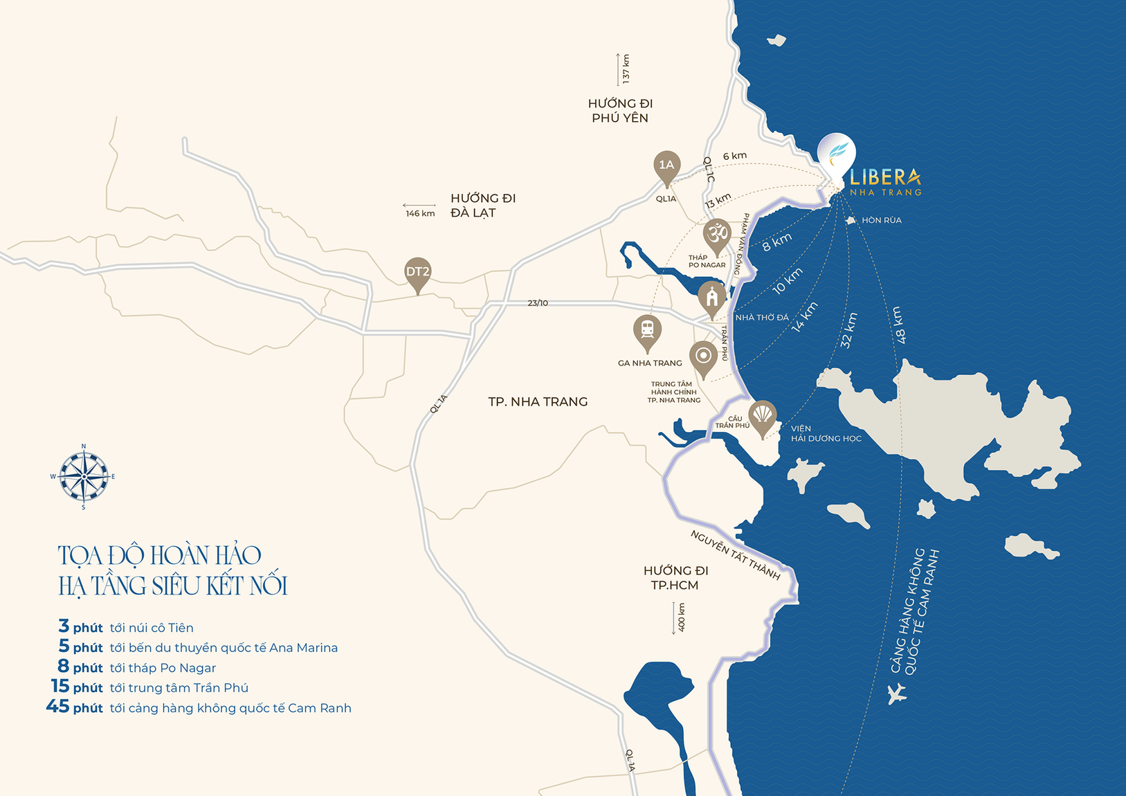 "Đủ gần để kết nối - đủ xa để riêng tư - đủ hiếm để là duy nhất"Toạ lạc trên cung đường Trần Phú nối dài. Nằm ngay Bãi Tiên thơ mộng. Trước mặt là biển, sau lưng là núi. Libera Nha Trang sở hữu liên kết vùng vượt bậc, cách TP.HCM chỉ hơn 4 tiếng lái xe, nằm trong tam giác du lịch Nha Trang - Đà Lạt - Phú Yên. Từ dự án dễ dàng tiếp cận hàng loạt danh lam - thắng cảnh bản địa, mở cửa ra là tự do đi muôn nơi!